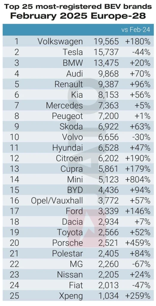 In February, Tesla ranked second with 15,737 registrations in Europe, trailing behind Volkswagen with 19,565 registrations—a 180% year-over-year increase for the German automaker.